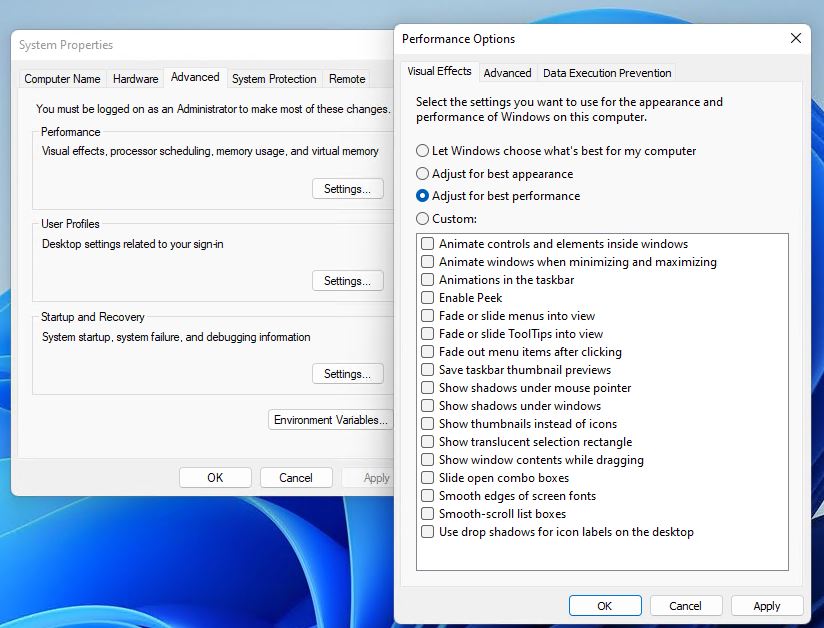 - 关视觉效果:系统属性>高级>性能设置。
