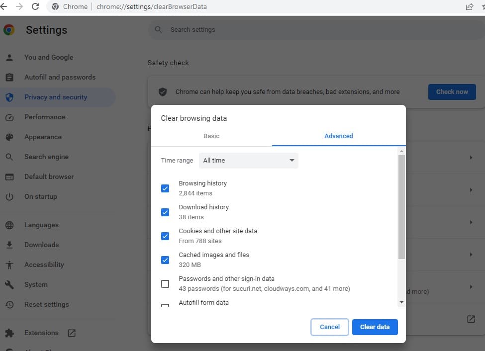 - 打开 Chrome 设置,转到“隐私和安全”,然后单击“清除浏览数据”