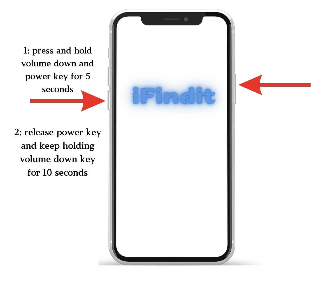 - 当屏幕变黑时,同时按住音量减小键和电源键 5 秒钟。然后,松开电源键,但继续按住音量调低按钮 10 秒钟