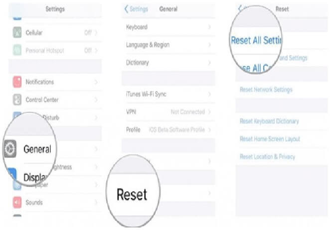 您的 iPhone 的设置需要设置为默认设置。需要注意的是,某些设置会导致启动循环问题。从“设置”菜单中,您可以选择“常规”选项。然后,点击重置选项并按重置所有设置选项。