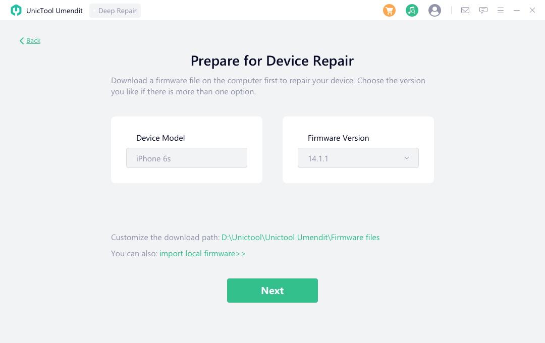 - 步骤 4-Umendit 将开始选择固件版本。点击“开始”按钮并打开修复过程。