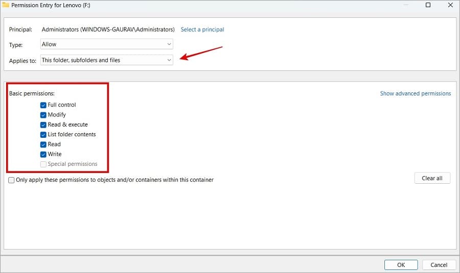- 从下拉菜单中选择“此文件夹、子文件夹和文件”选项,然后选中除“特殊权限”之外的以下所有选项。