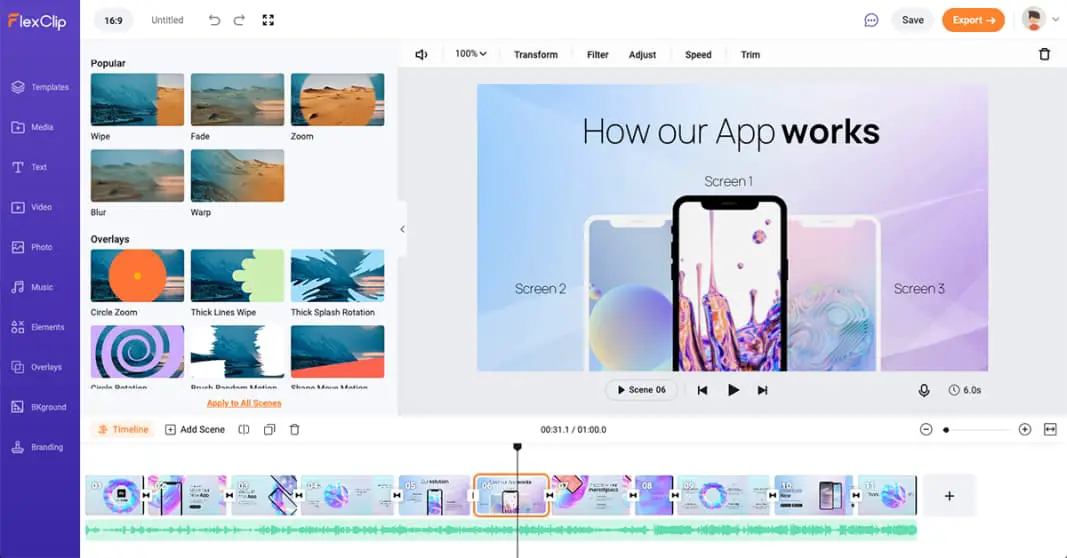 该软件几乎具备您在传统视频编辑器中所期望的所有视频效果:不透明度、色度键控、过渡等。您还会喜欢智能组织的媒体库,它集成了智能搜索,可让您轻松找到草稿和完成的文件。
