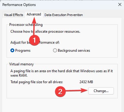 - 选择高级选项卡,然后单击虚拟内存旁边的更改按钮,