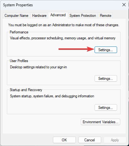 - 前往“先进的”选项卡并单击“设置”“性能”部分下的按钮。