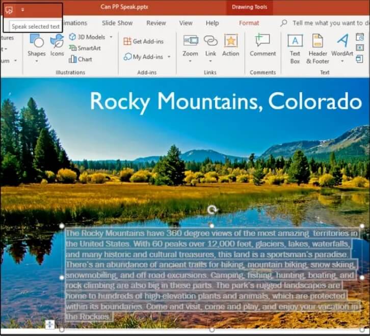 - 第4步:设置文本转语音功能后,必须确保声音设备和系统扬声器已打开。接下来,您需要突出显示适用幻灯片内的文本,或者您也可以突出显示目标幻灯片的注释。