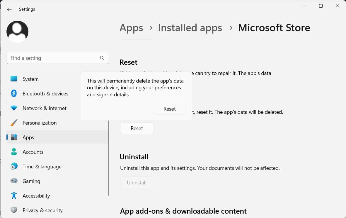 - 如果没有,请单击“重置”按钮将 Microsoft 商店恢复为默认设置。