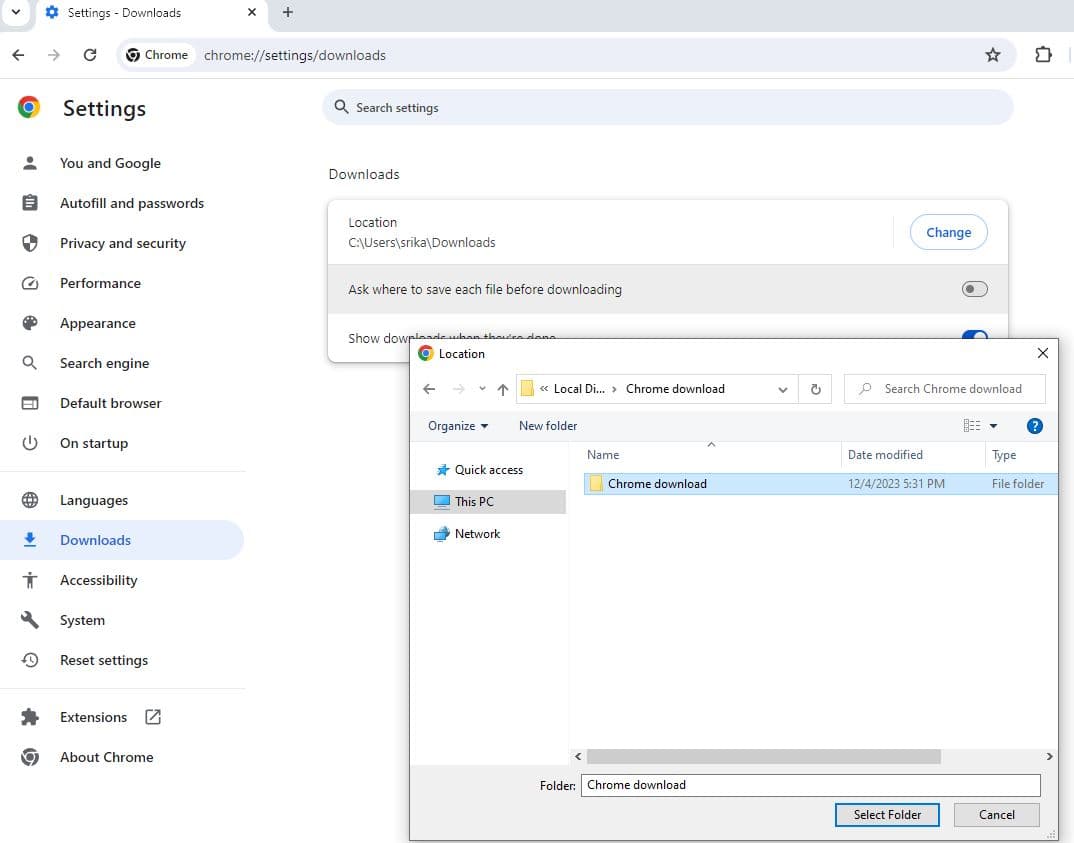 默认情况下,Chrome将下载保存在计算机上的下载文件夹中。但是,此文件夹可能已满或损坏,这可能会减慢您的下载。