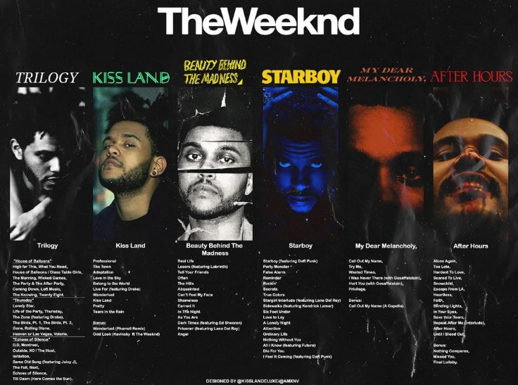 这些歌曲取得了巨大的商业成功,并在全球排行榜上名列前茅。 The Weeknd 独特的声音和迷人的歌声为他赢得了大批忠实的粉丝。