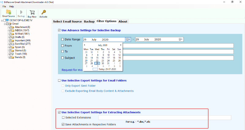 过滤器选项:该工具还具有各种数据过滤器选项,例如日期范围、主题、电子邮件地址等,以便在此过程中对 EarthLink 电子邮件附件进行排序。