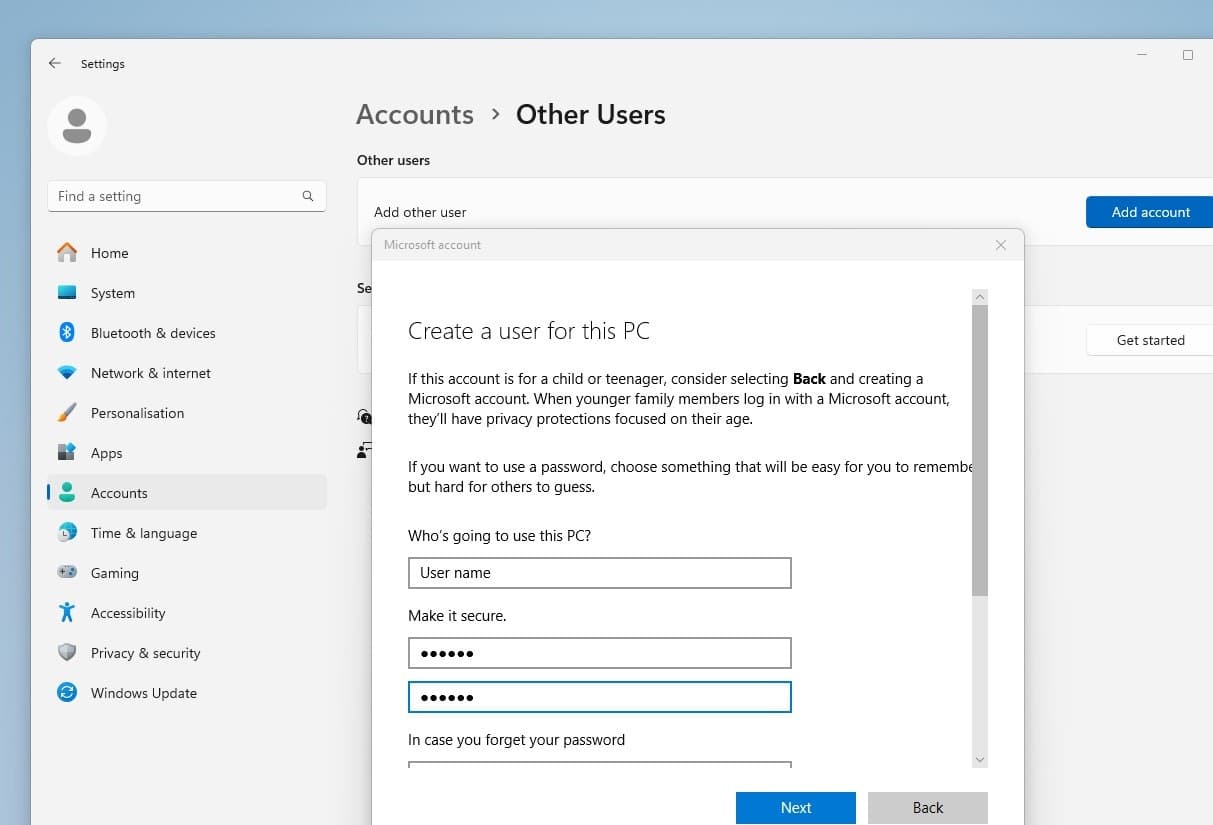 - 单击左侧菜单上的“帐户”,然后选择其他用户