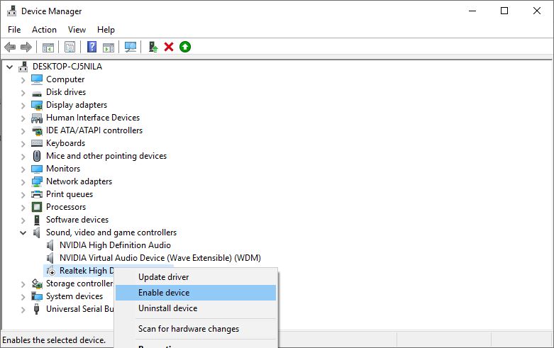 - 她右键单击已安装的音频驱动程序,然后选择启用设备如果它被禁用。