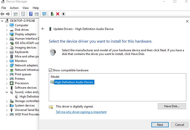 - 选择高清晰度音频设备,选择下一步并按照说明进行安装。