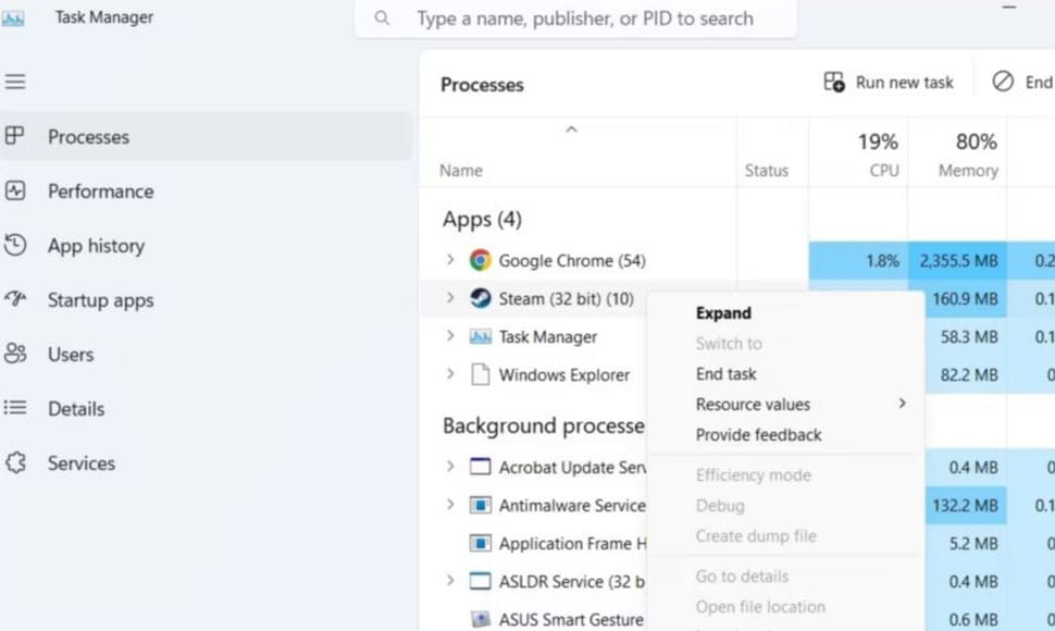 - 按Ctrl + Shift + Esc打开任务管理器。在“进程”选项卡中,右键单击“Steam”,然后从上下文菜单中选择“结束任务”。