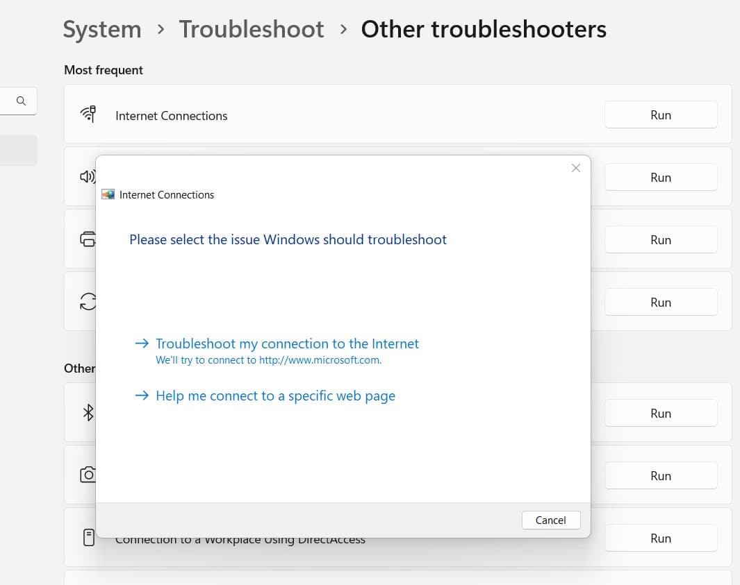 - 另外,从同一菜单运行“Internet 连接疑难解答”。