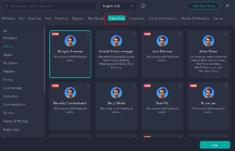 多样的声音选择:探索各种声音类型,包括名人、说唱歌手、动漫人物、电影人物等。