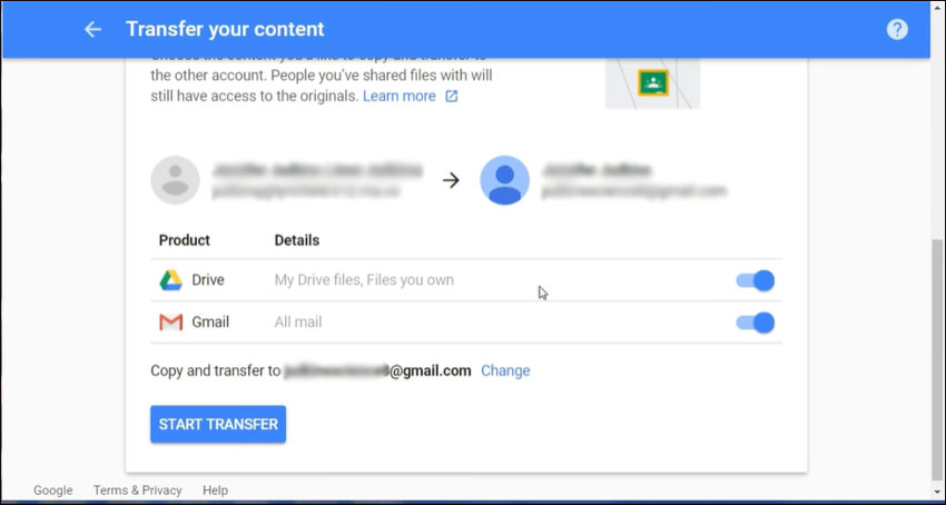 - 选择您要复制的数据。它允许复制 Google Drive 内容以及电子邮件。之后,按开始传输按钮并完成该过程。