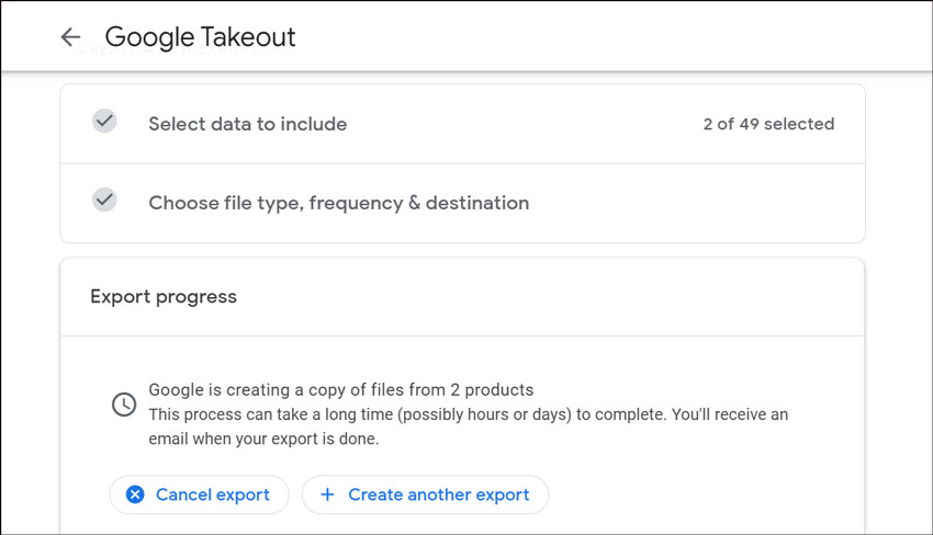 注意 -这个过程可以最多需要一周的时间,完成后您将在您的个人 Google 帐户中收到一封电子邮件通知。另外,请注意Gmail 联系人和待办事项列表无法使用此服务进行转移。
