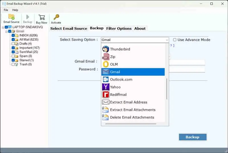 - 如果您想将电子邮件备份到另一种电子邮件服务,从 Gmail、Outlook.com、Office 365、Yahoo 和 Rediffmail 中选择您所需的电子邮件服务,然后输入您的帐户凭据(电子邮件地址和密码)。