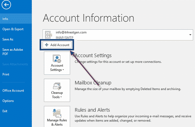1. 启动 Outlook 并单击文件,然后按添加帐户。