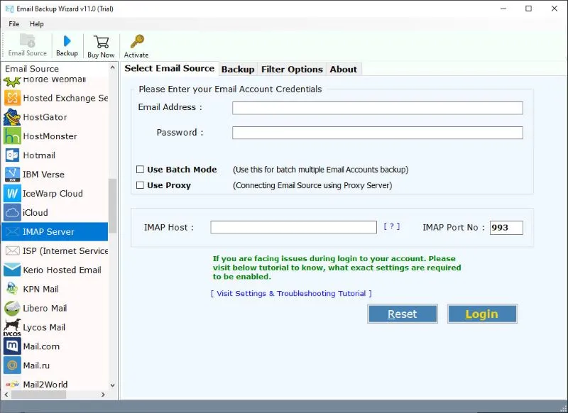 - 在该工具中,选择IMAP 选项作为您的电子邮件来源。输入您的Thexyz Webmail 电子邮件凭据,包括您的密码和IMAP 服务器详细信息。
