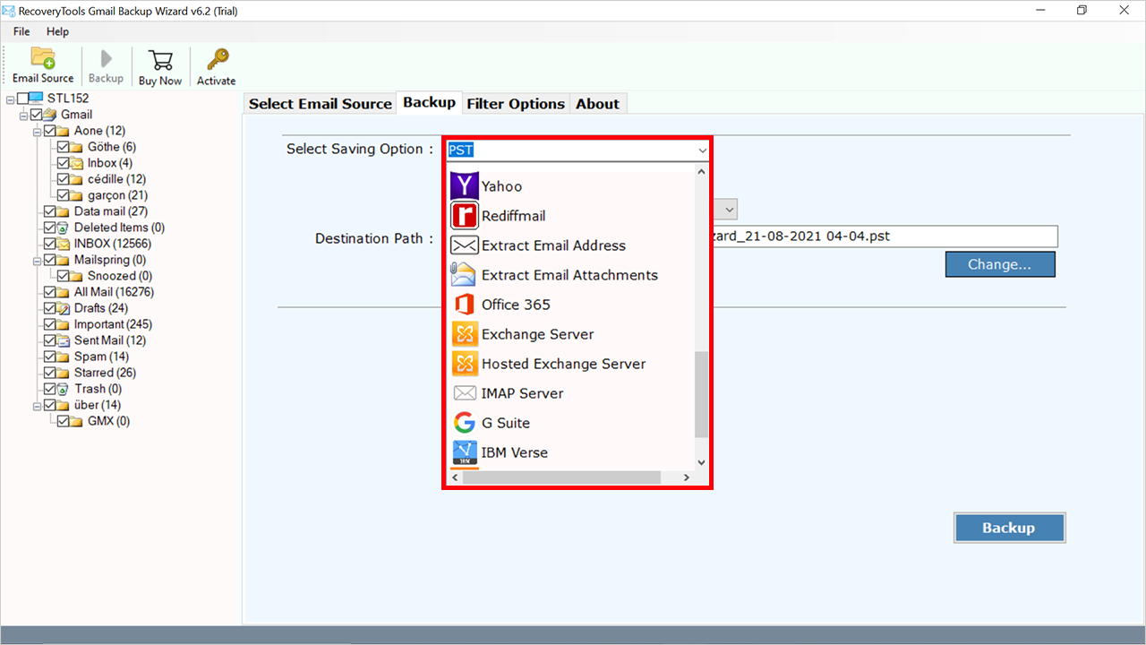 - 单击“备份”按钮开始从 Gmail 到 G Suite 的迁移。