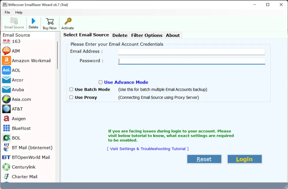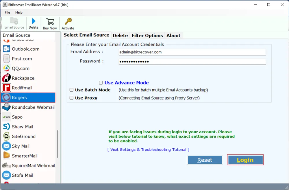 - 选择罗杰斯从可用的电子邮件来源,输入凭据,然后点击登录按钮删除罗杰斯电子邮件。