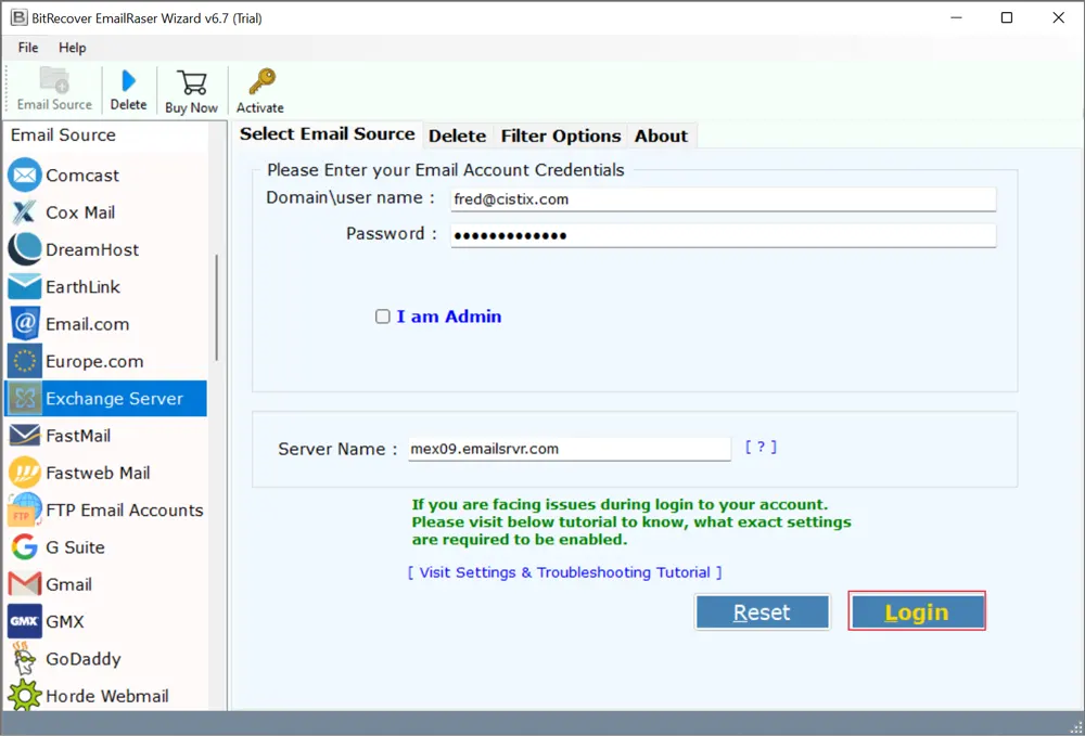 - 此后,选择交换服务器作为电子邮件来源,输入帐户凭据,然后按登录。