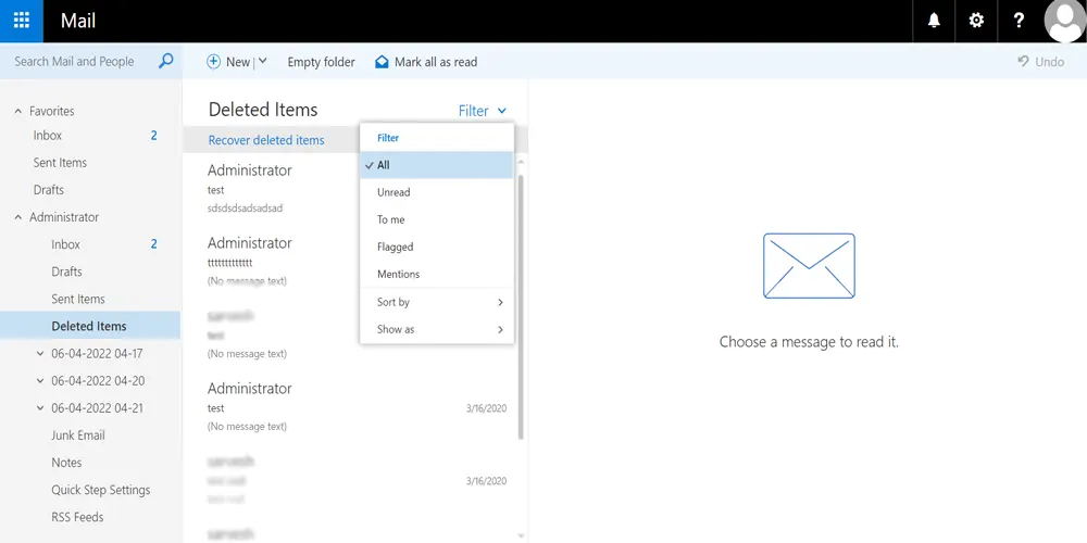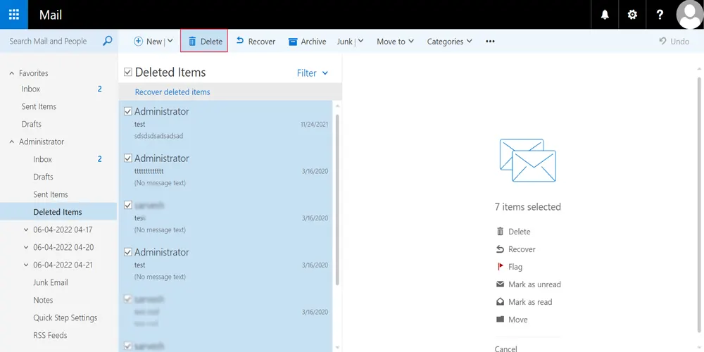 - 必须首先从特定文件夹中删除 Exchange 电子邮件,然后必须再次从“已删除邮件”文件夹中删除才能永久删除。