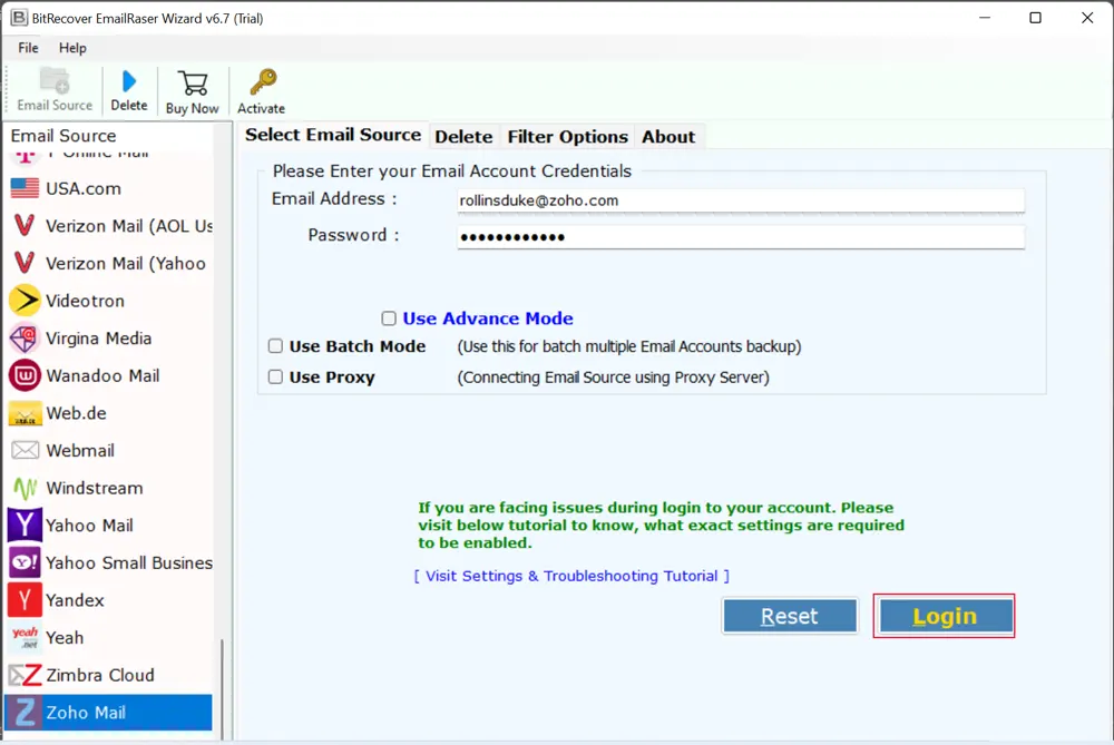 - 在您的计算机上启动 Zoho Mail Eraser。选择Zoho Mail从源列表中输入帐户凭据,然后按登录按钮。