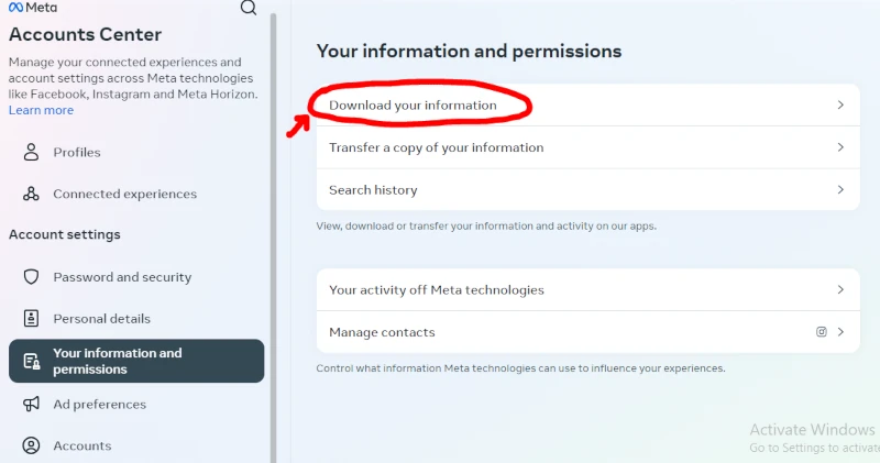 此选项专门用于下载 Instagram 数据的副本并将其传输到特定位置。请按照以下步骤了解如何在所需路径删除帐户之前下载 Instagram 数据:
