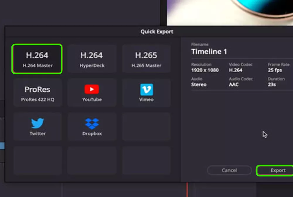 笔记:某些导出选项仅限于 DaVinci Resolve 的工作室版本,例如超过 4K 的导出和高达 120 fps 的导出。如果免费版本中没有 H.265,请选择 H.264。