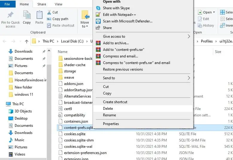 - 现在退出 Firefox,在您的配置文件夹中找到并删除 content-prefs.sqlite。 (别担心,下次打开 Firefox 时它会重新创建。)