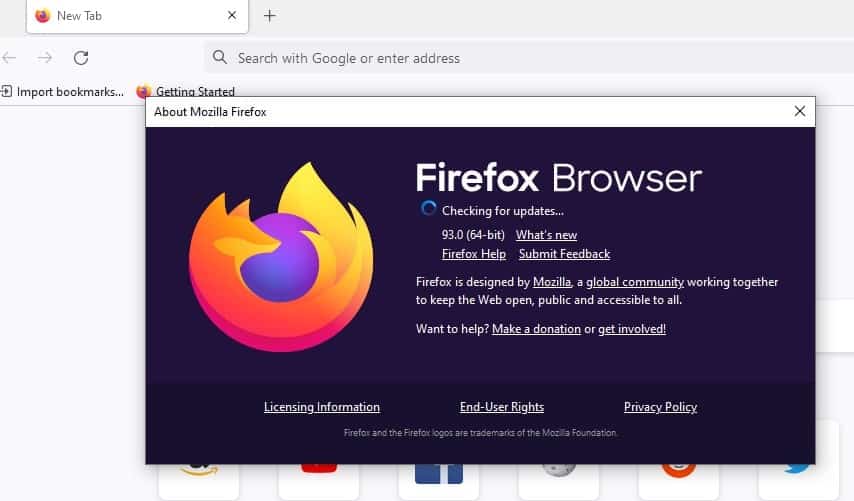 - 从子菜单中选择关于 Firefox。如果有任何可用更新,它们将自动安装。
