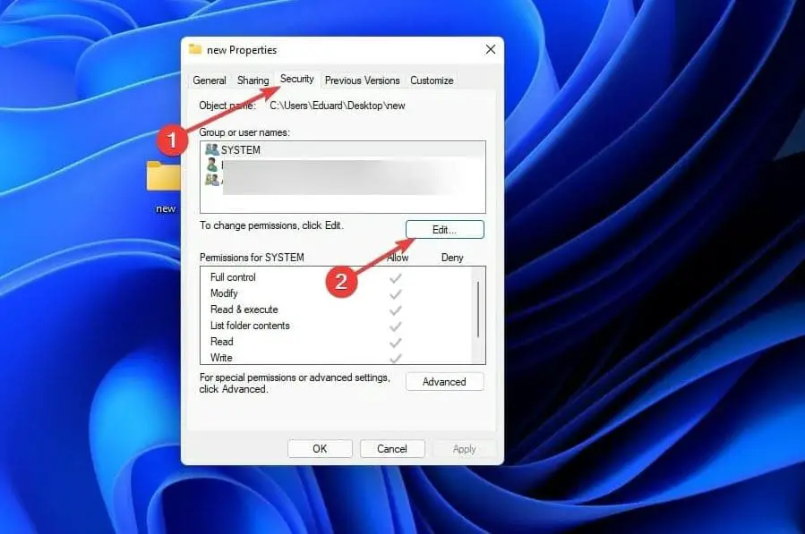 - 在“安全”选项卡下,单击“编辑”按钮。