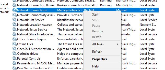 - 找到网络列表服务 > 右键单击它 > 选择重新启动。