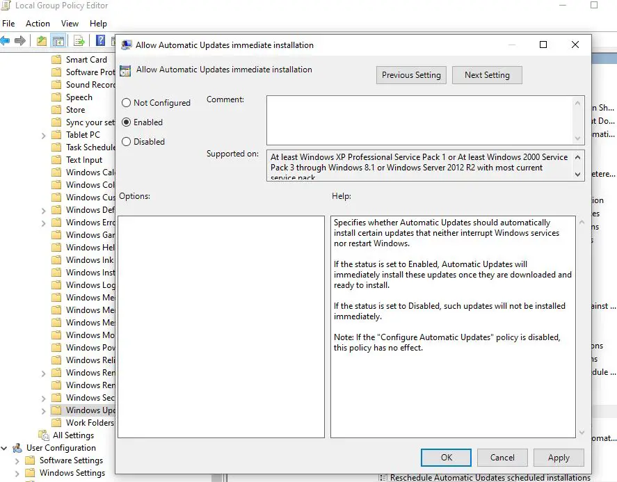 使用打开组策略编辑器gpedit.msc,导航配置 > 管理模板 > Windows 组件 > Windows 更新。双击策略“自动更新立即安装”并启用它。