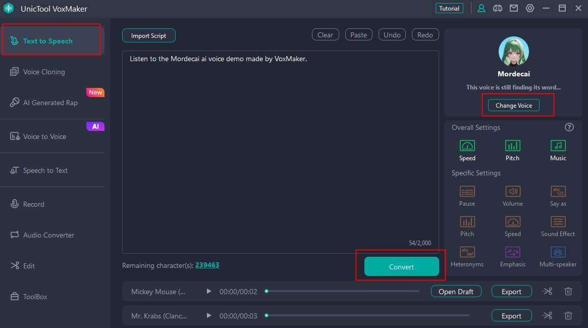 - 步骤2:导航到左侧边栏中的“文本转语音”选项,然后单击“更改语音”并找到您需要的 Mordecai 语音。