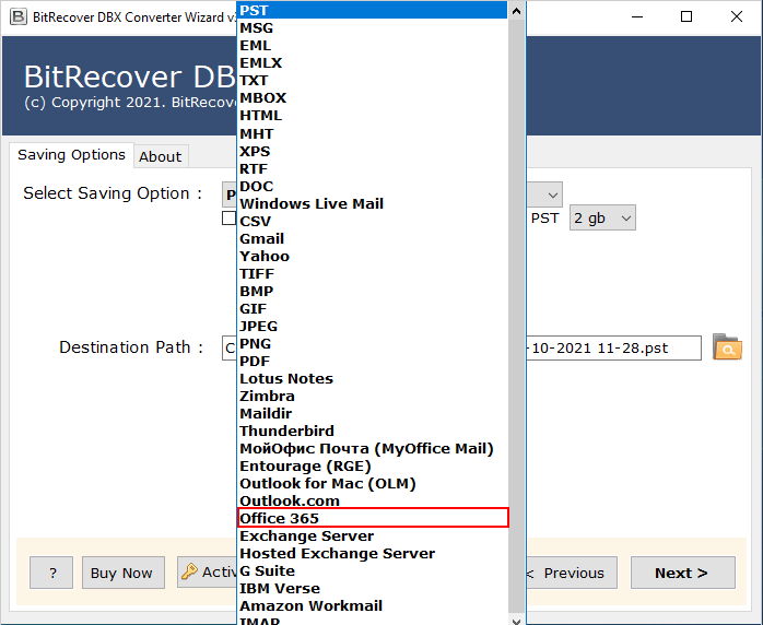 - 选择 DBX 文件并选择 Office 365 作为保存格式。