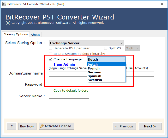 6. 用户可以将生成的 Exchange Server 数据的语言更改为荷兰语、法语、德语、西班牙语、瑞典语等。