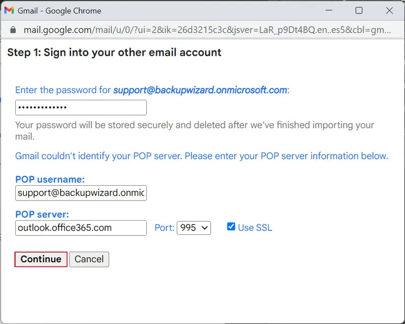 - 最后,输入密码并单击继续弹出窗口中的按钮启动将 MBOX 文件上传到 Gmail 的过程。