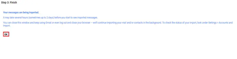 - 最后,点击“好的”按钮并等待该过程完成以将 MBOX 导入 Gmail。