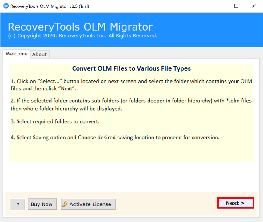 - 首先,开始OLM 导入 iCloud 邮件导入器并仔细阅读操作说明。