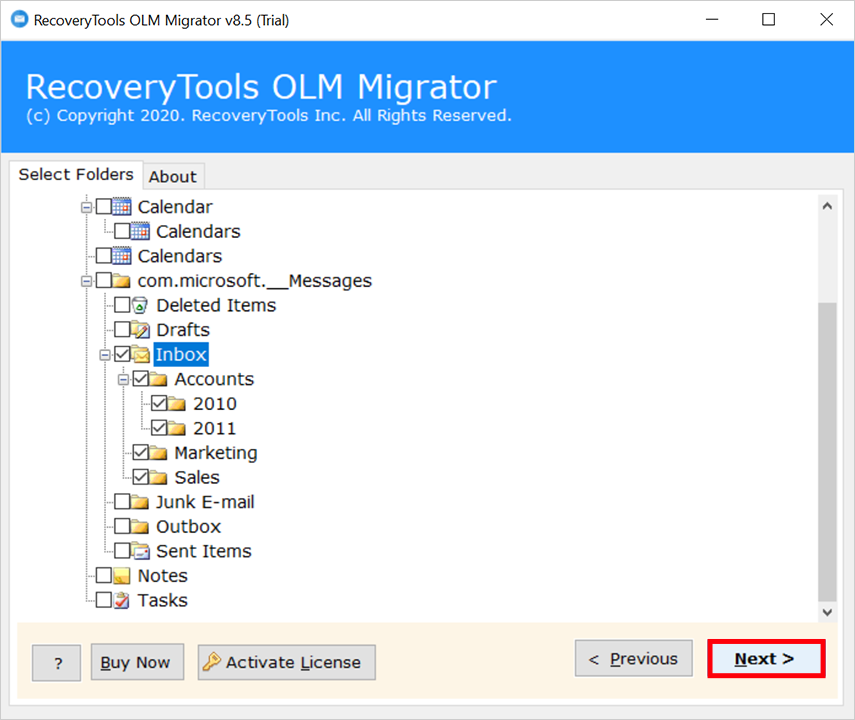- 此后,您可以在软件面板中看到 OLM 文件夹。选择所需文件夹并按下一个。