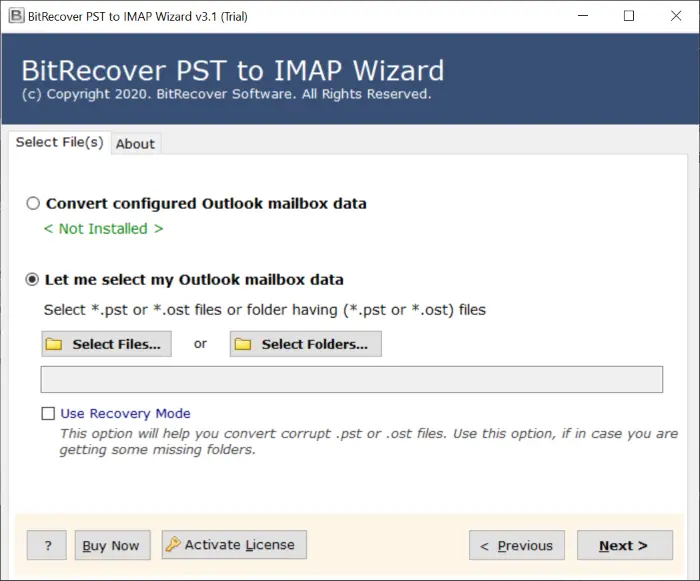 - 该工具可以从配置的 Outlook 添加 PST 文件。它还提供手动插入 PST 文件的双重选项,即选择文件或选择文件夹。