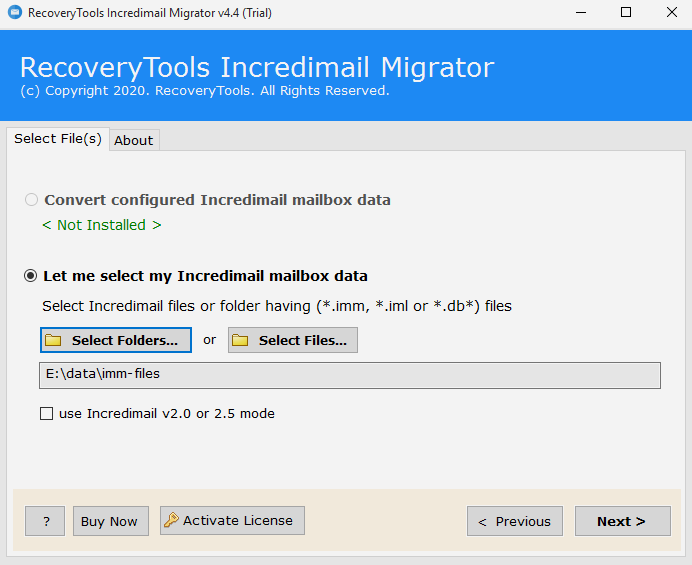 下载、运行并安装 WLM to Yahoo Software。通过单击在产品 GUI 中上传 Windows Live Mail 文件选择文件或选择文件夹选项。