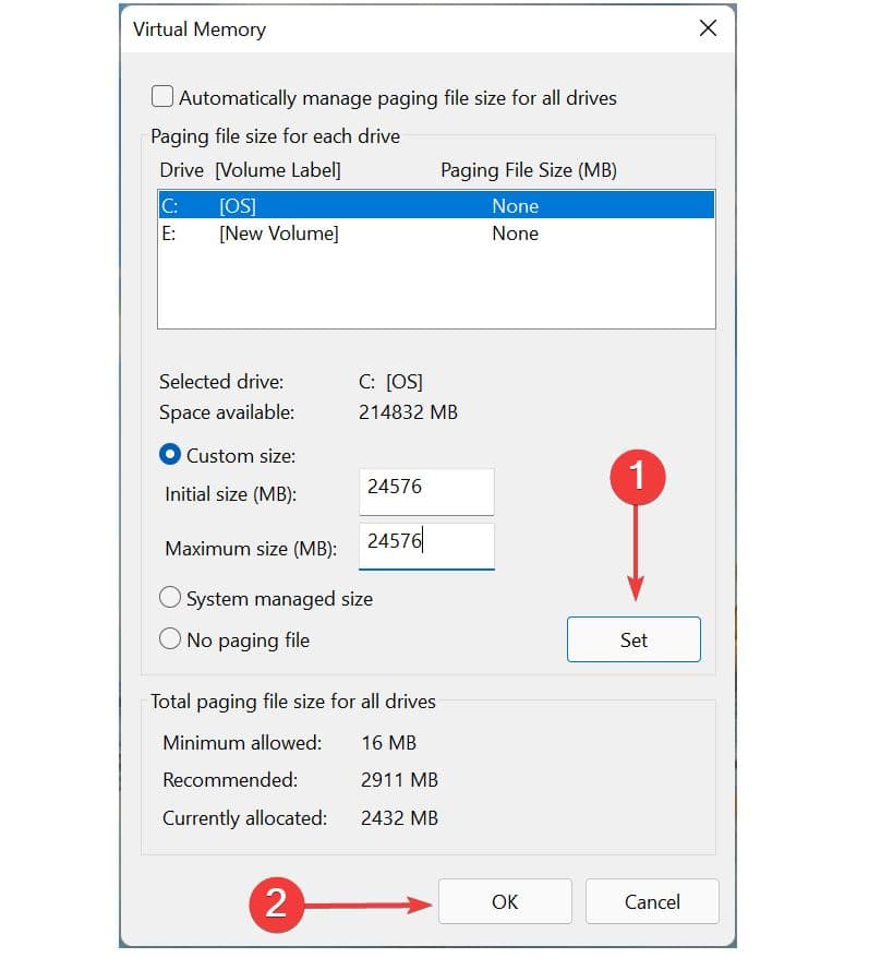 - 要在 Windows 11 上自定义虚拟内存大小,请取消选中自动管理选项,然后选择自定义大小。