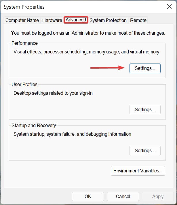- 移至“高级”选项卡,在“性能”部分下选择“设置”