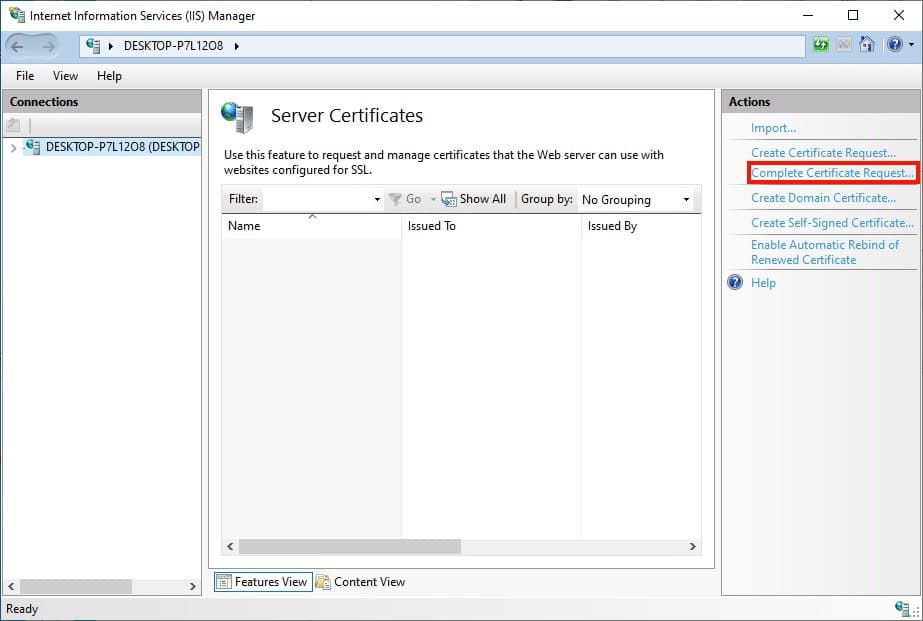 单击完成证书申请...在窗口右侧的“操作”窗格中。