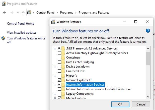 笔记:确保您的设备上启用了 IIS 功能,或者您可以按 Windows 键 + R,键入appwiz.cpl然后单击“确定”打开程序和功能,然后单击打开或关闭 Windows 功能选项来启用该功能。